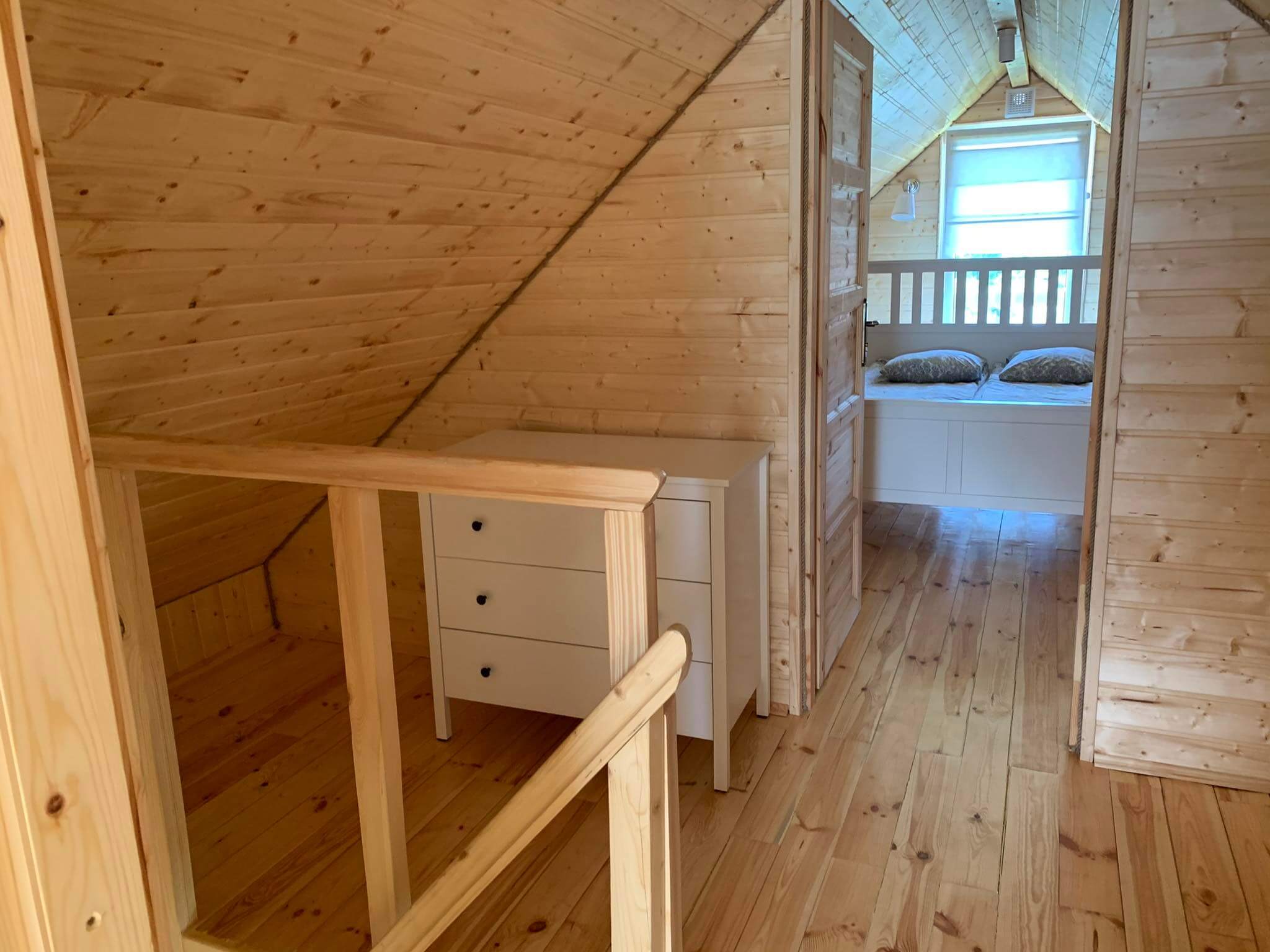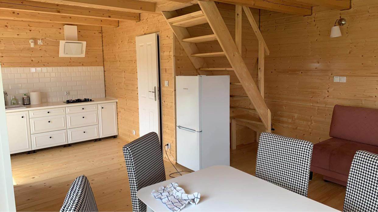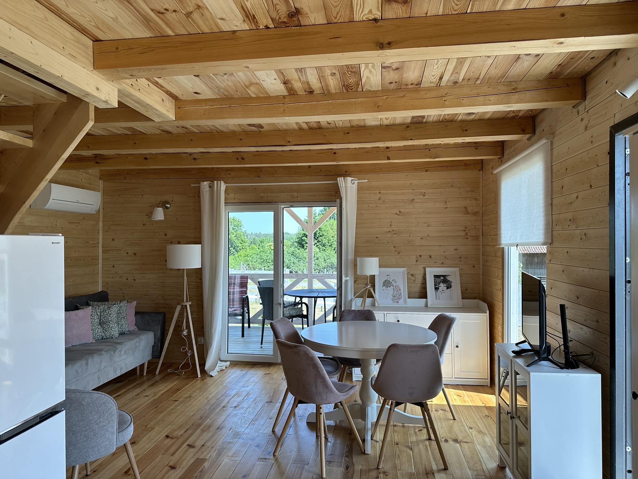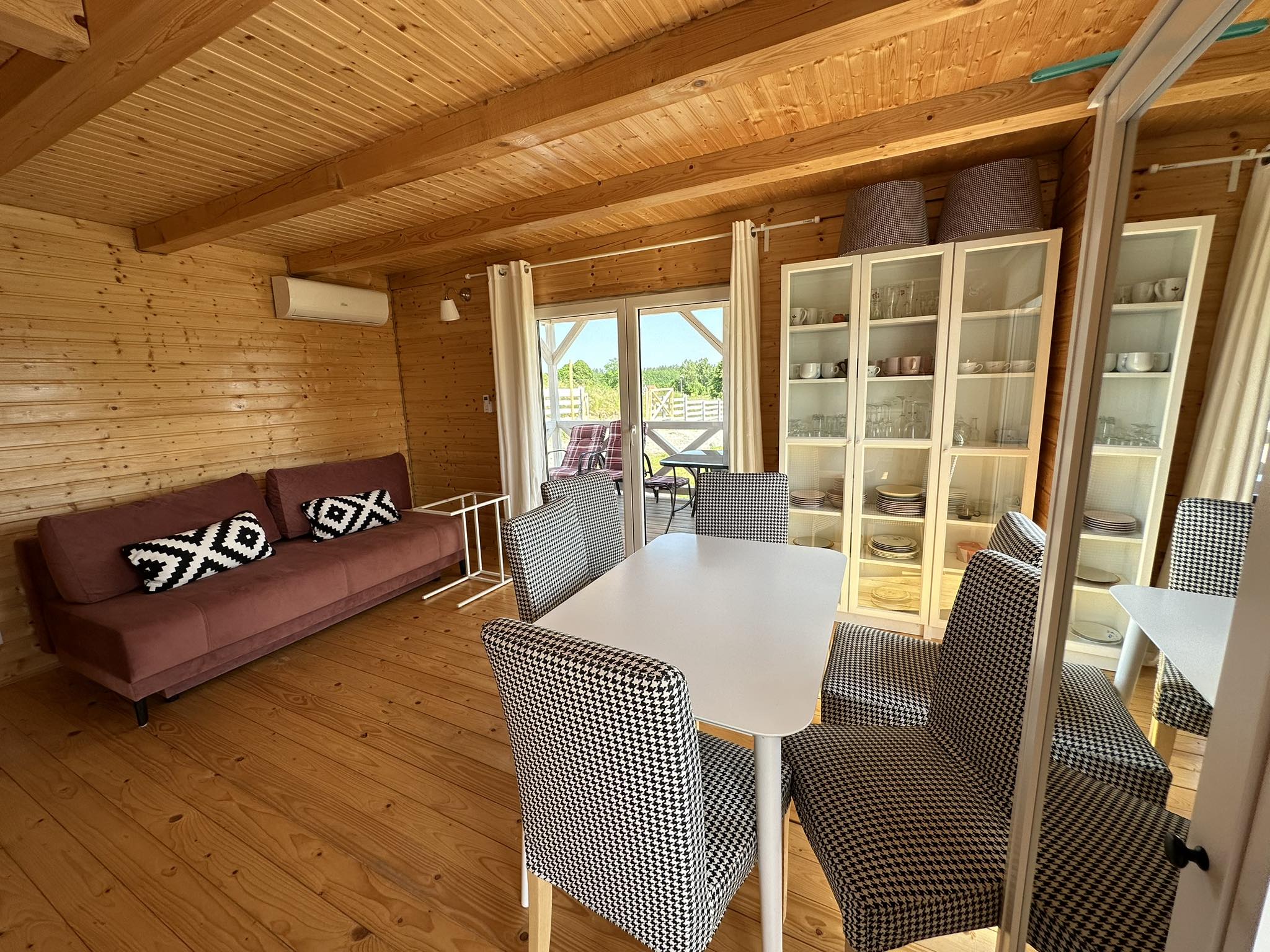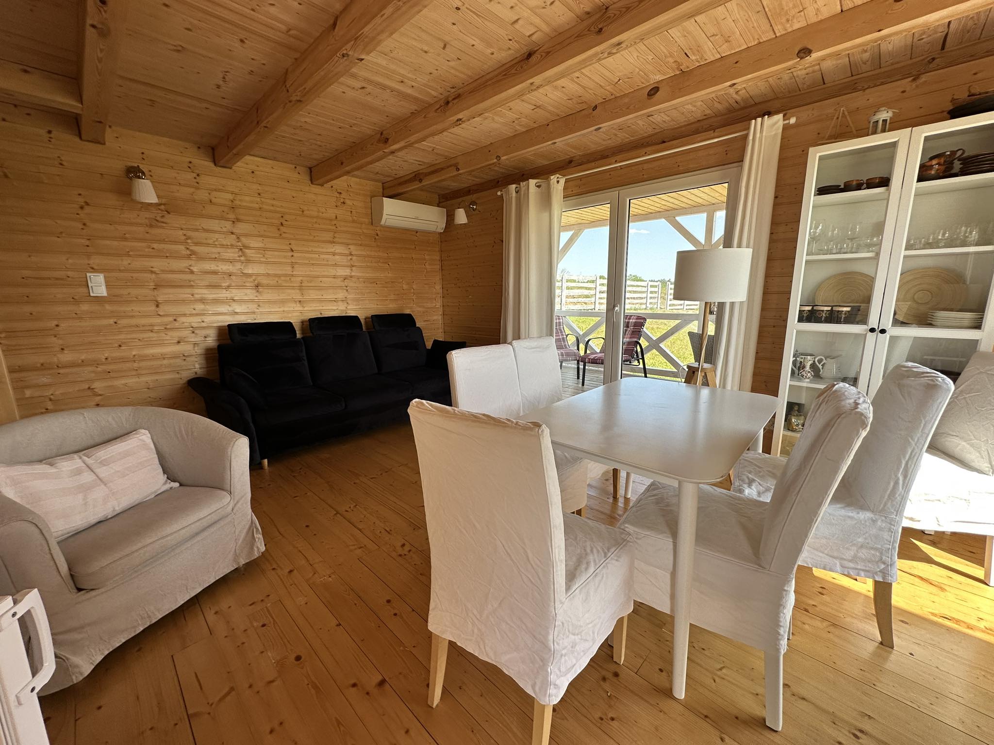 Drewniane domki letniskowe, 1-6 osobowe, pow 70m2. Do dyspozycji gości parter: salon z rozkładaną sofą, stół z krzesłami, aneks kuchenny wyposażony w lodówkę, zmywarkę, czajnik, kuchenkę gazową, naczynia. Oddzielny taras z meblami ogrodowymi. Piętro: 2 sypialnie dwuosobowe.