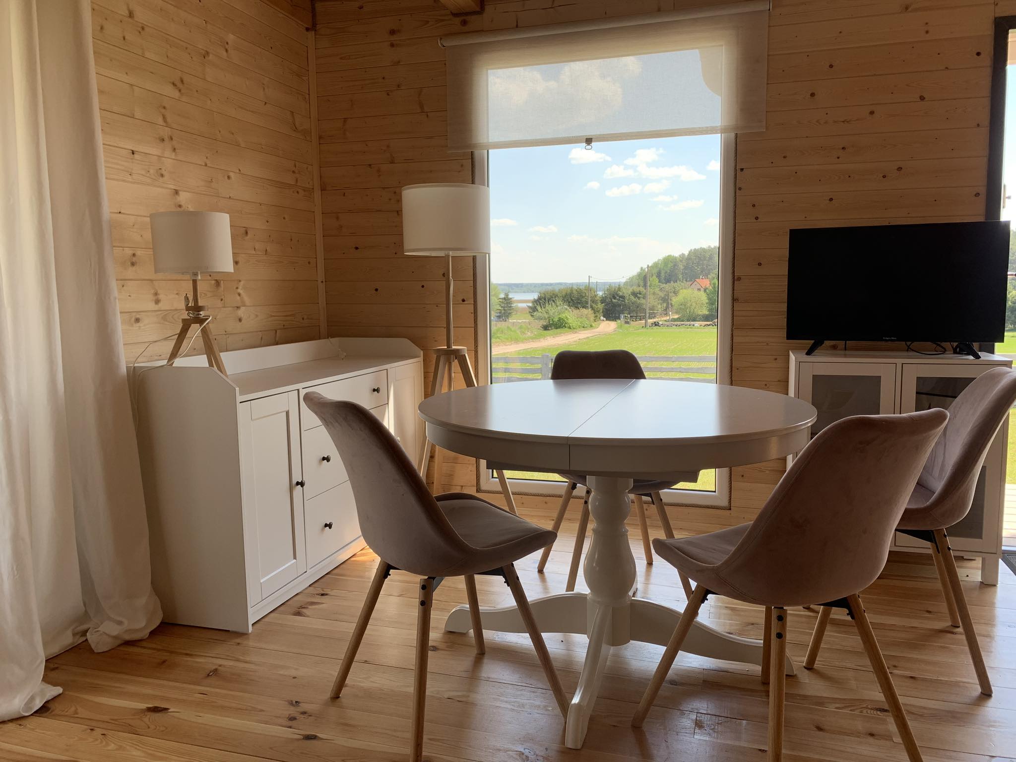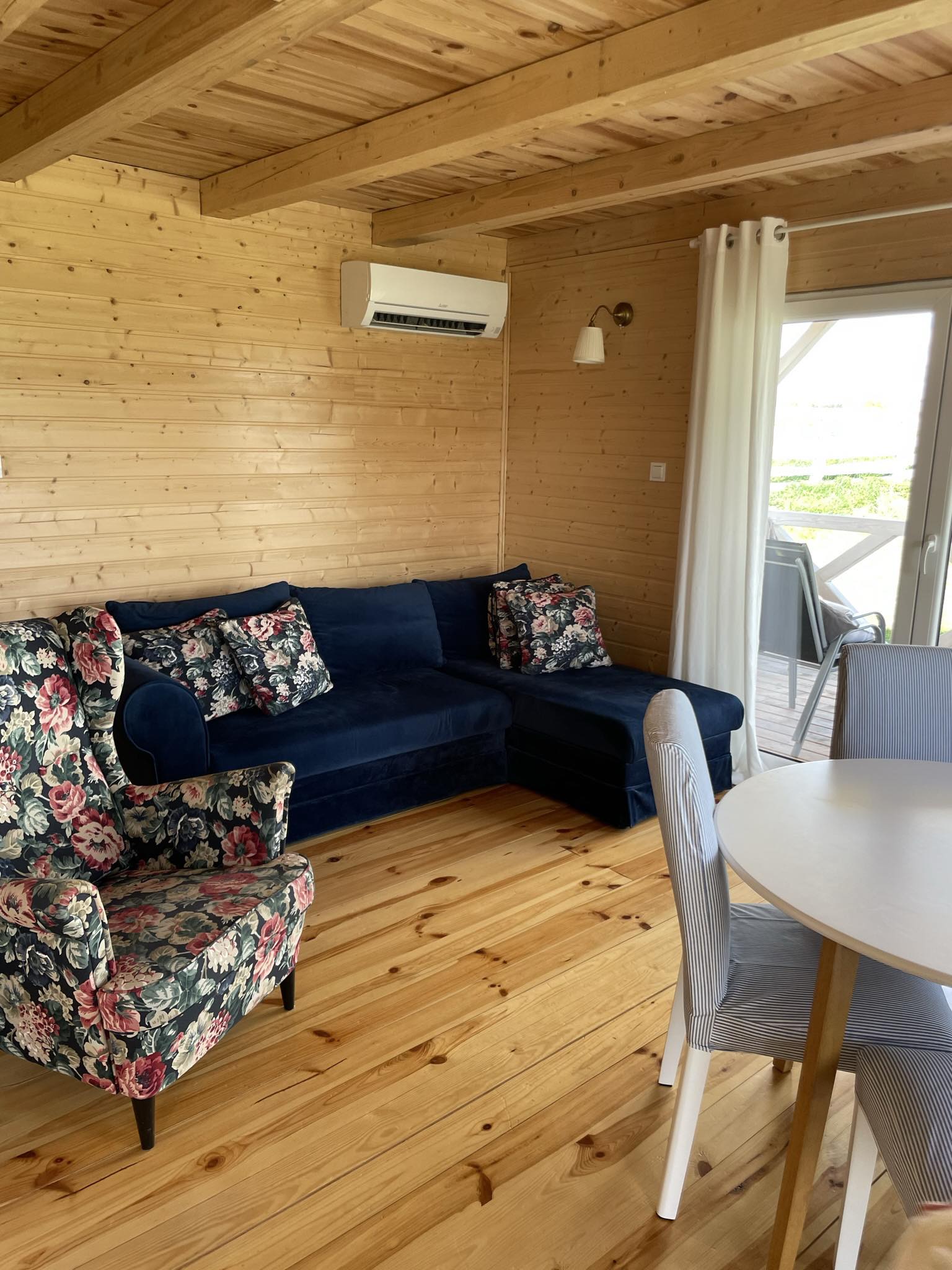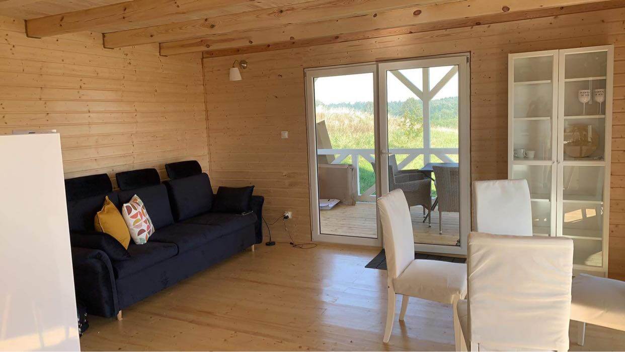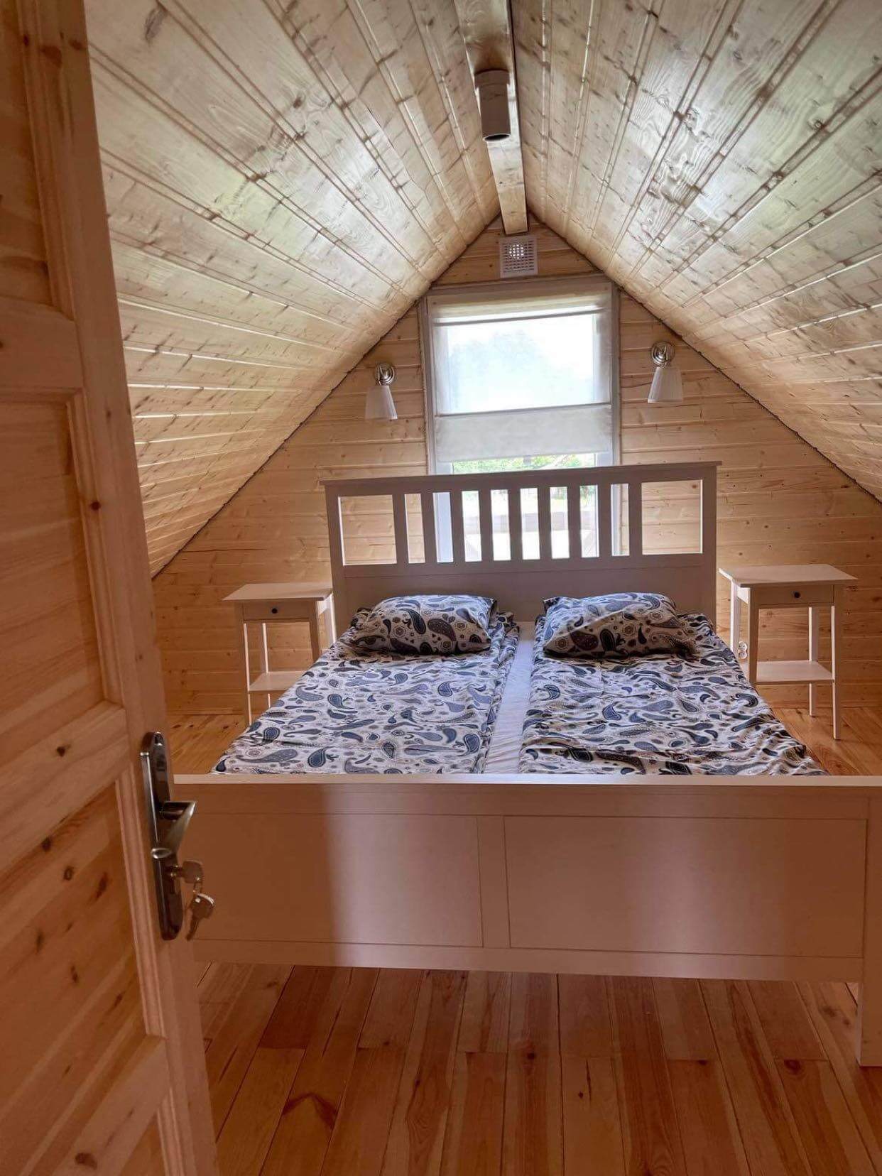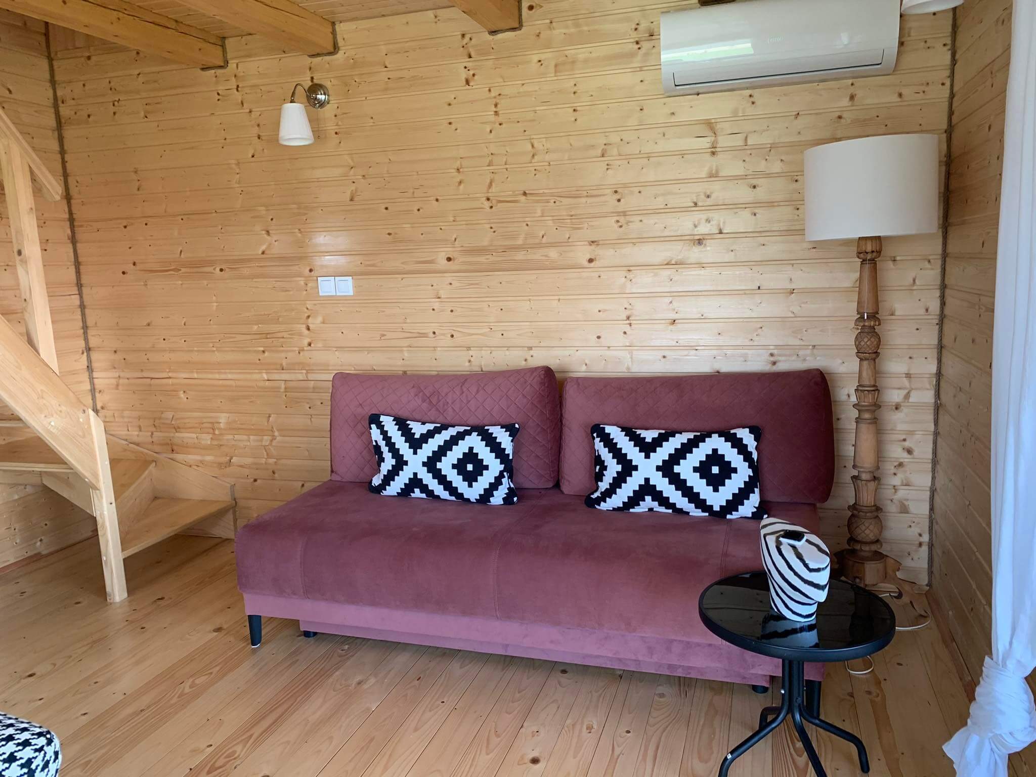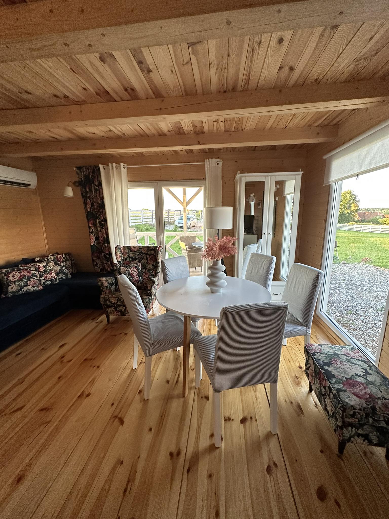 Drewniane domki letniskowe, 1-6 osobowe, pow 70m2. Do dyspozycji gości parter: salon z rozkładaną sofą, stół z krzesłami, aneks kuchenny wyposażony w lodówkę, zmywarkę, czajnik, kuchenkę gazową, naczynia. Oddzielny taras z meblami ogrodowymi. Piętro: 2 sypialnie dwuosobowe.