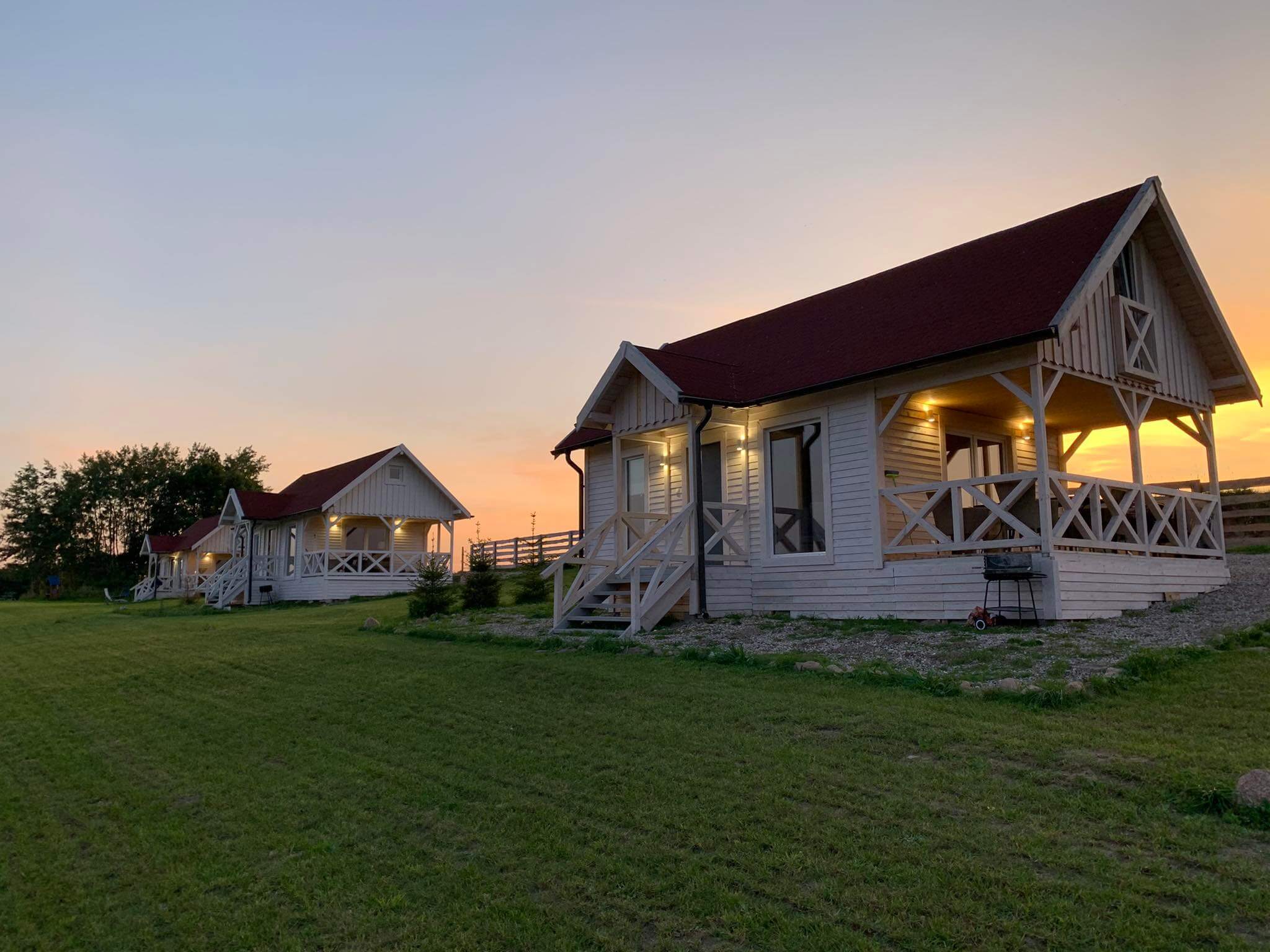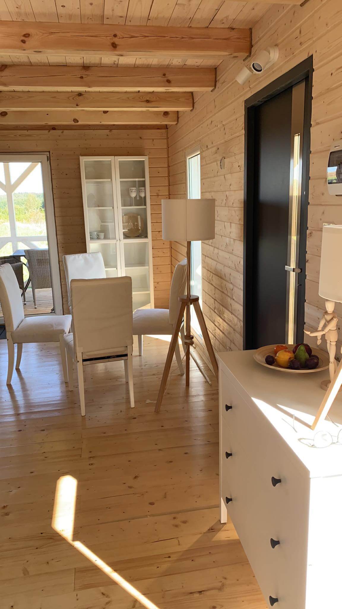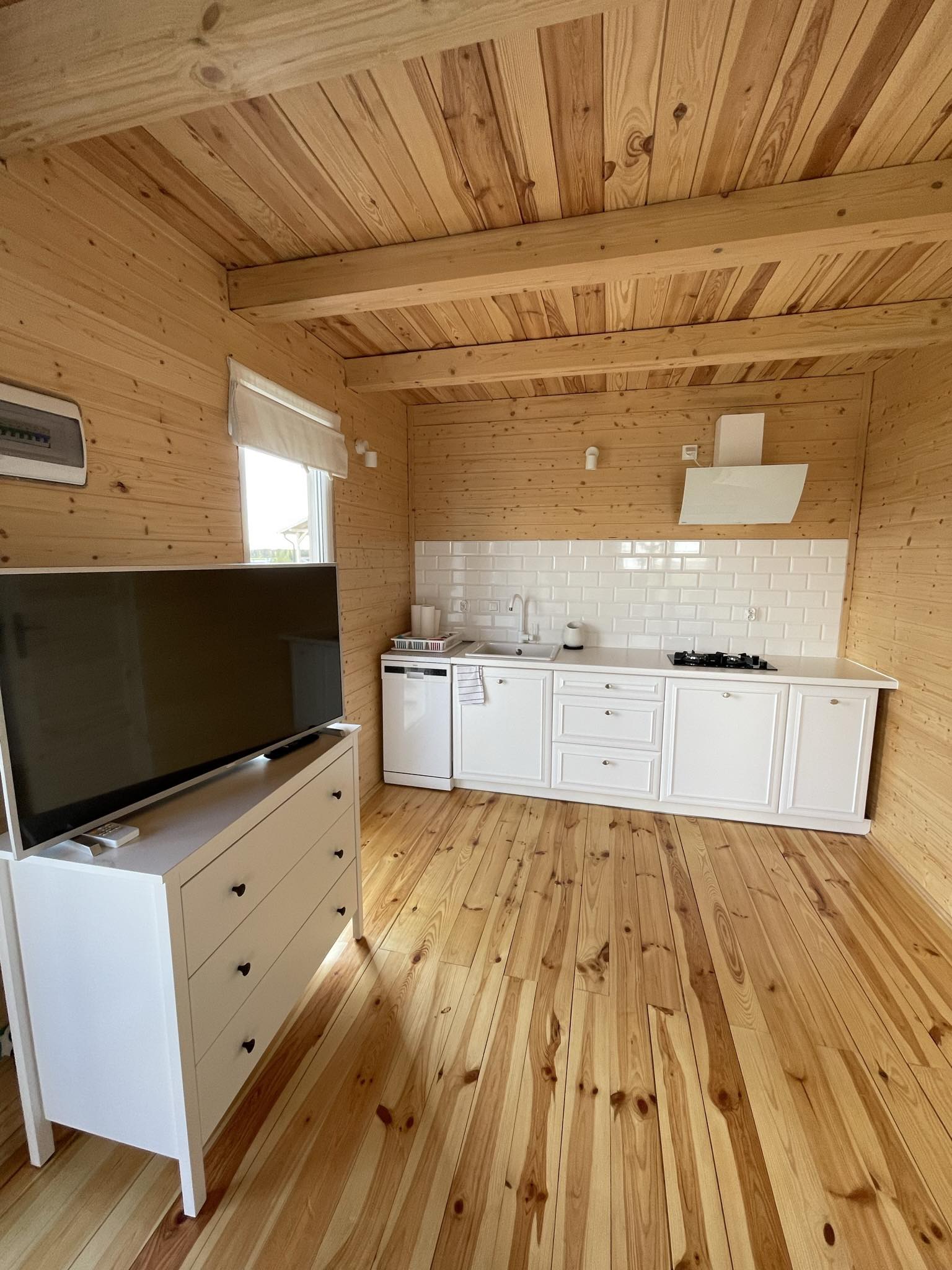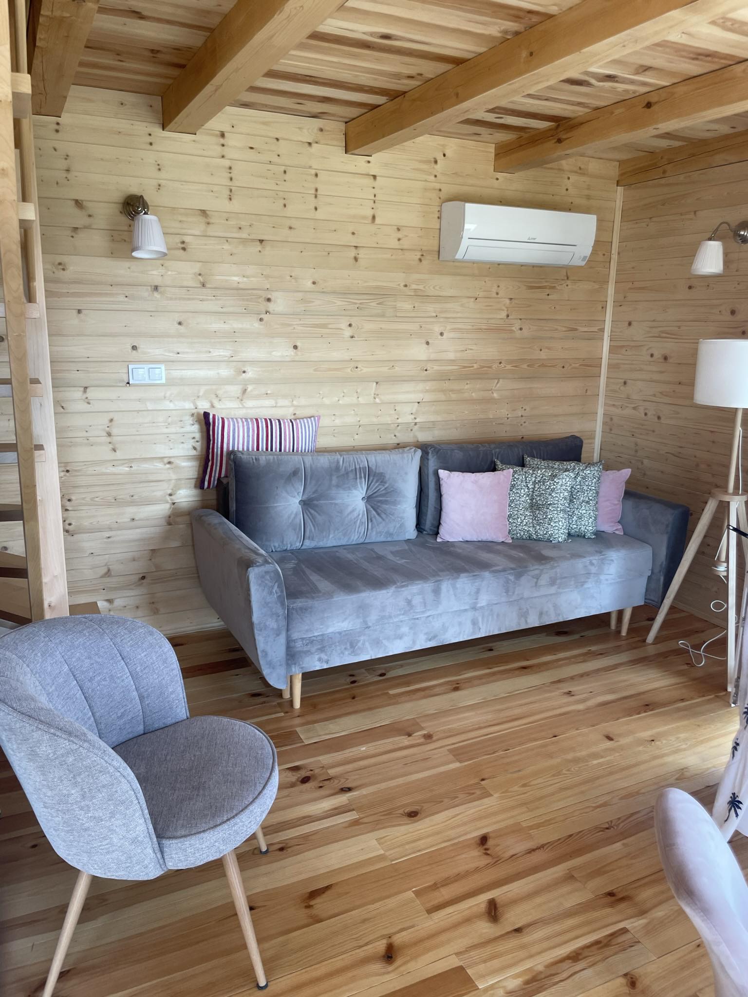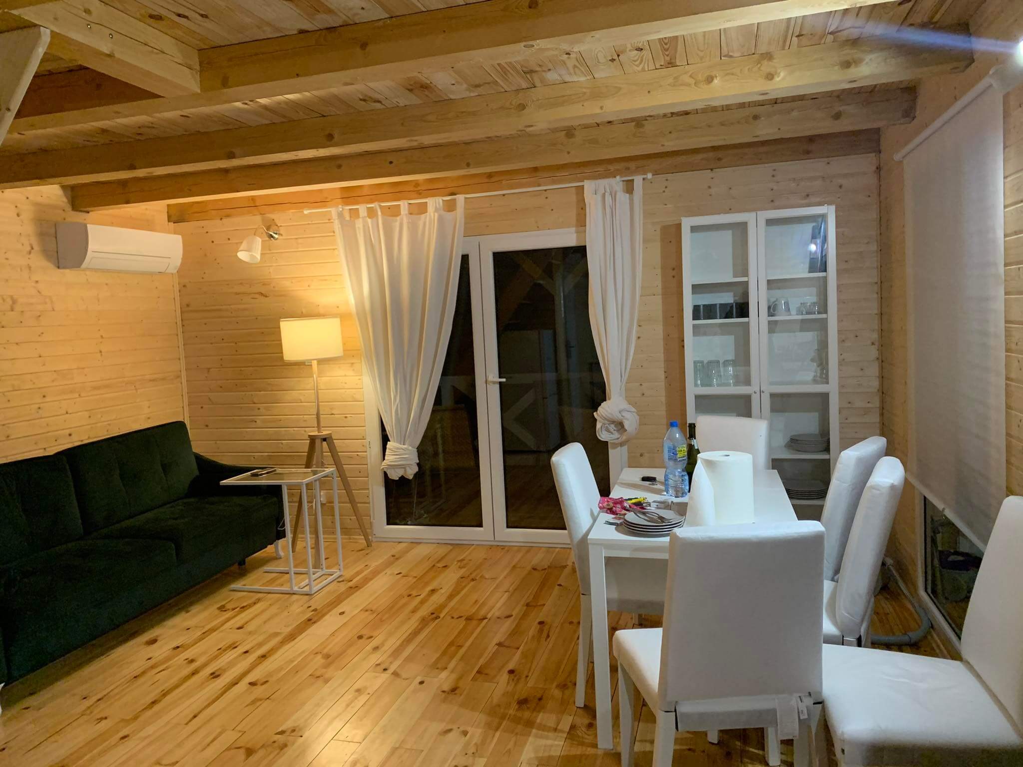 Drewniane domki letniskowe, 1-6 osobowe, pow 70m2. Do dyspozycji gości parter: salon z rozkładaną sofą, stół z krzesłami, aneks kuchenny wyposażony w lodówkę, zmywarkę, czajnik, kuchenkę gazową, naczynia. Oddzielny taras z meblami ogrodowymi. Piętro: 2 sypialnie dwuosobowe.