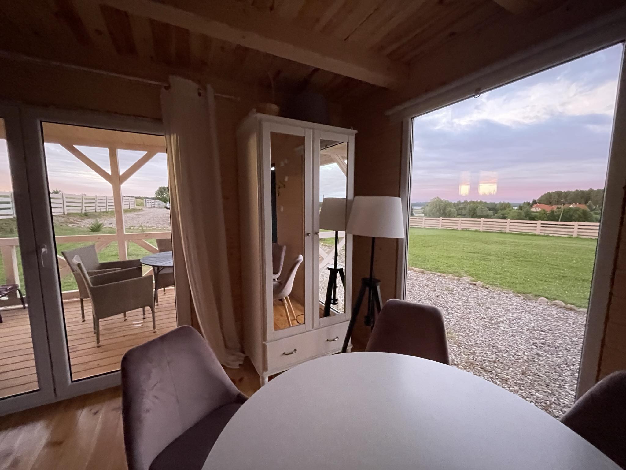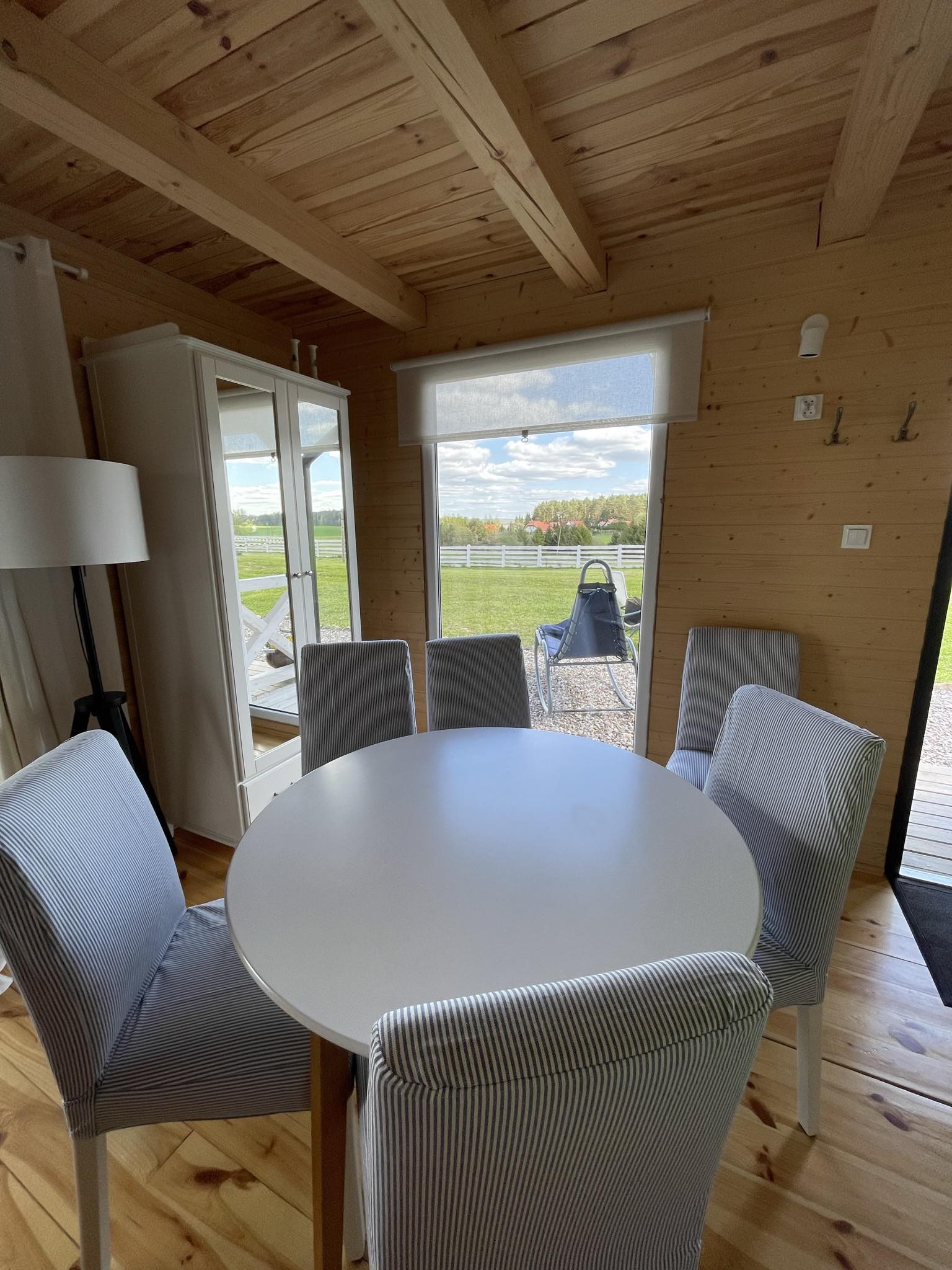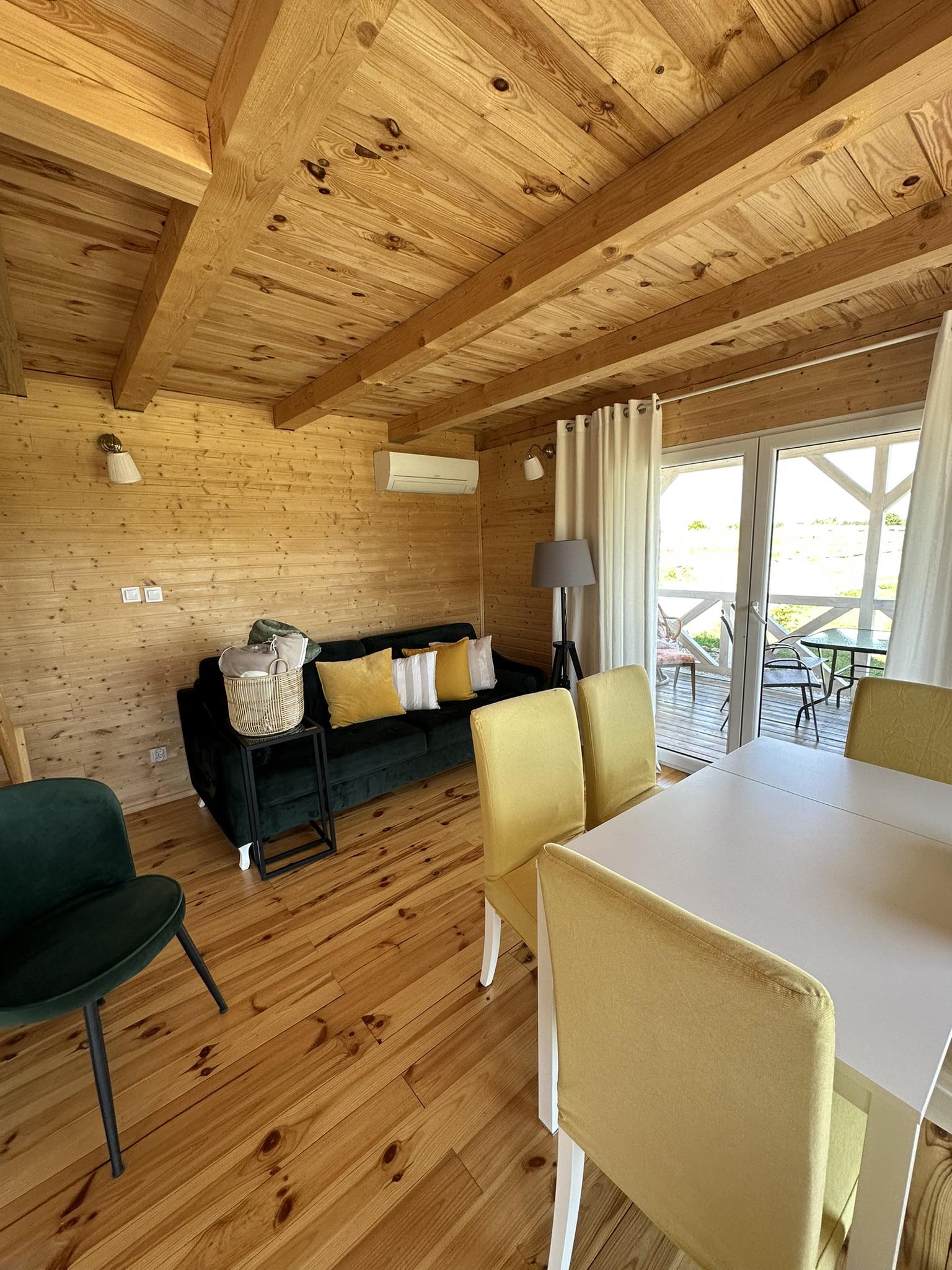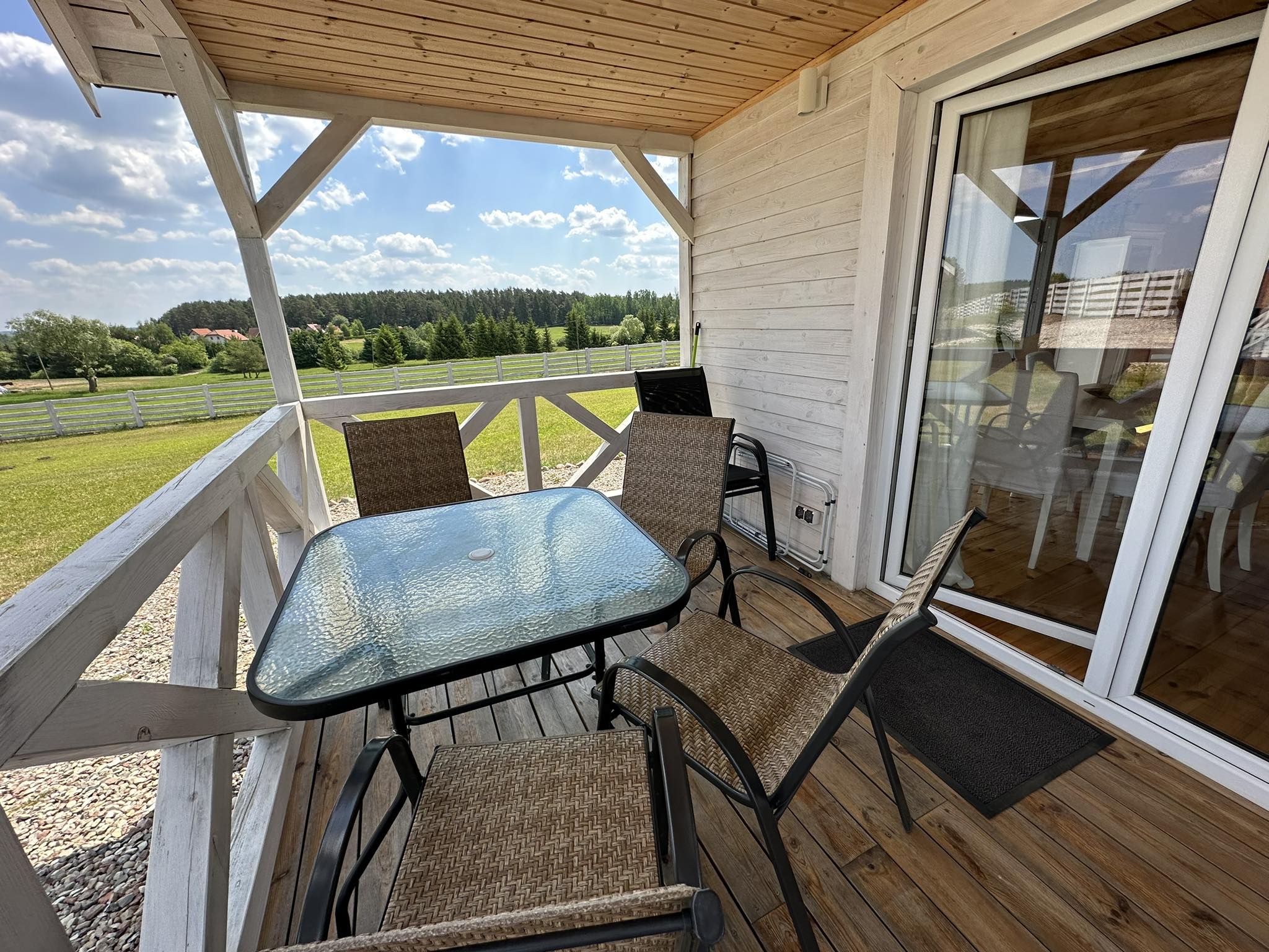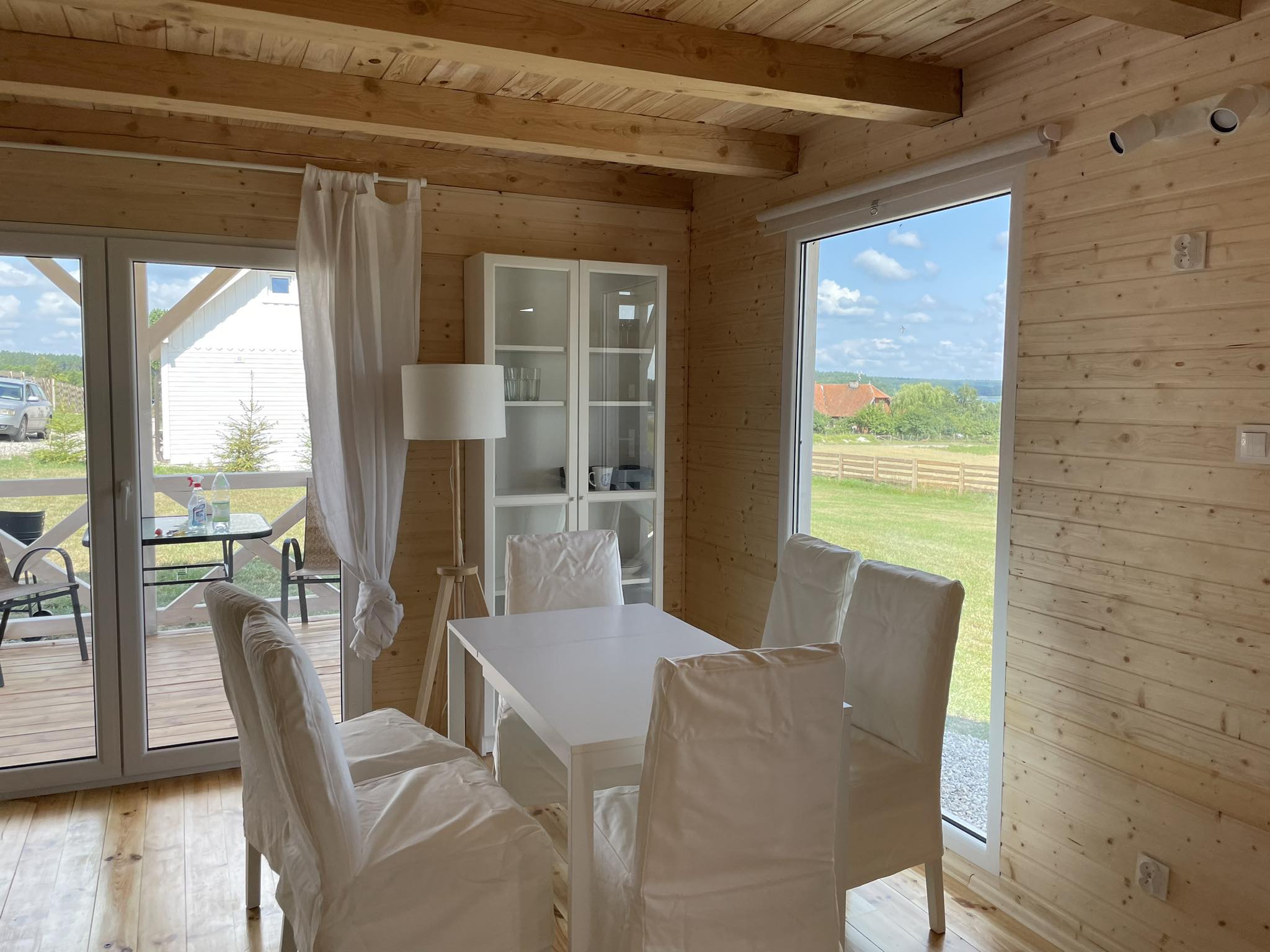 Drewniane domki letniskowe, 1-6 osobowe, pow 70m2. Do dyspozycji gości parter: salon z rozkładaną sofą, stół z krzesłami, aneks kuchenny wyposażony w lodówkę, zmywarkę, czajnik, kuchenkę gazową, naczynia. Oddzielny taras z meblami ogrodowymi. Piętro: 2 sypialnie dwuosobowe.