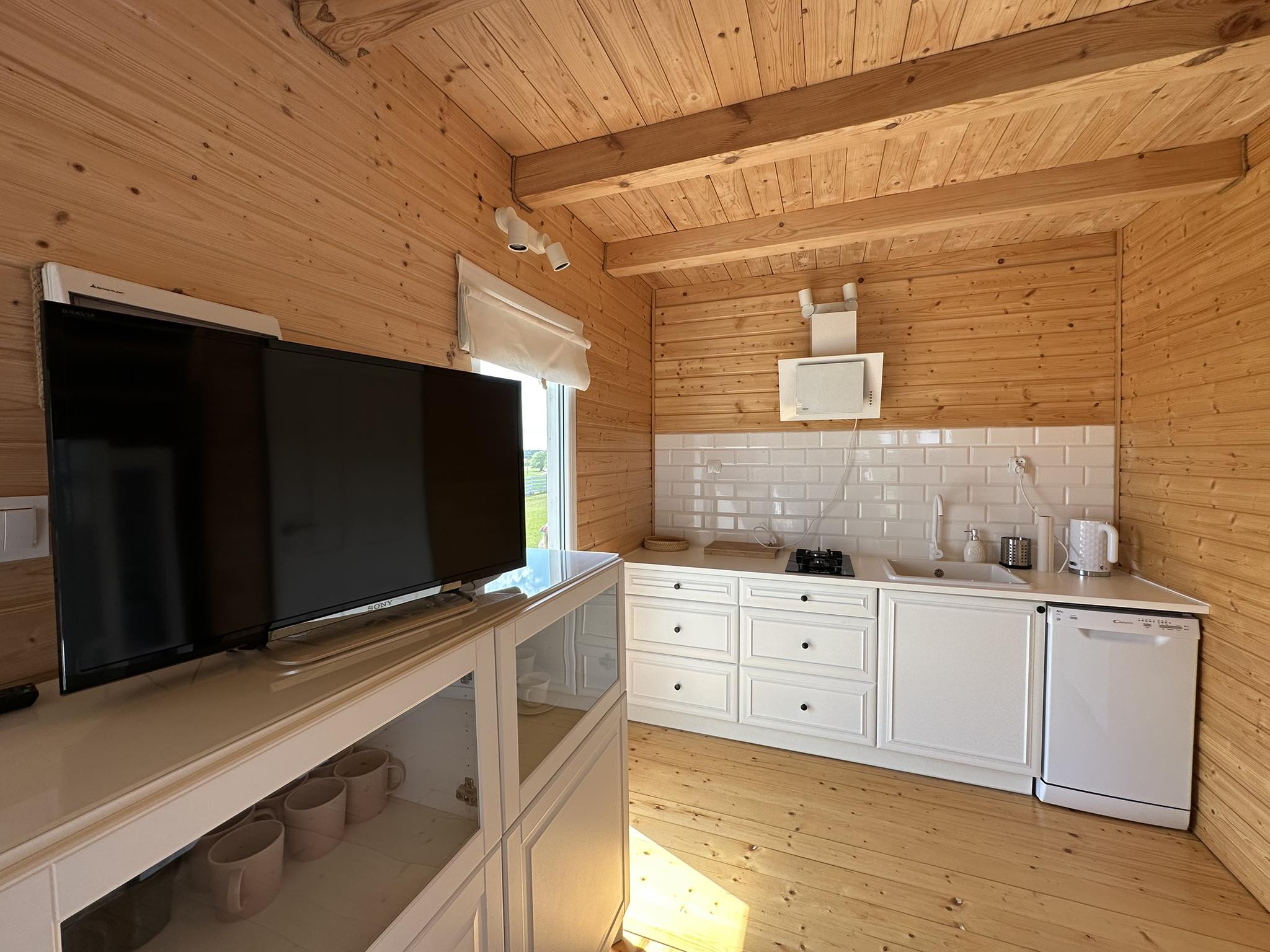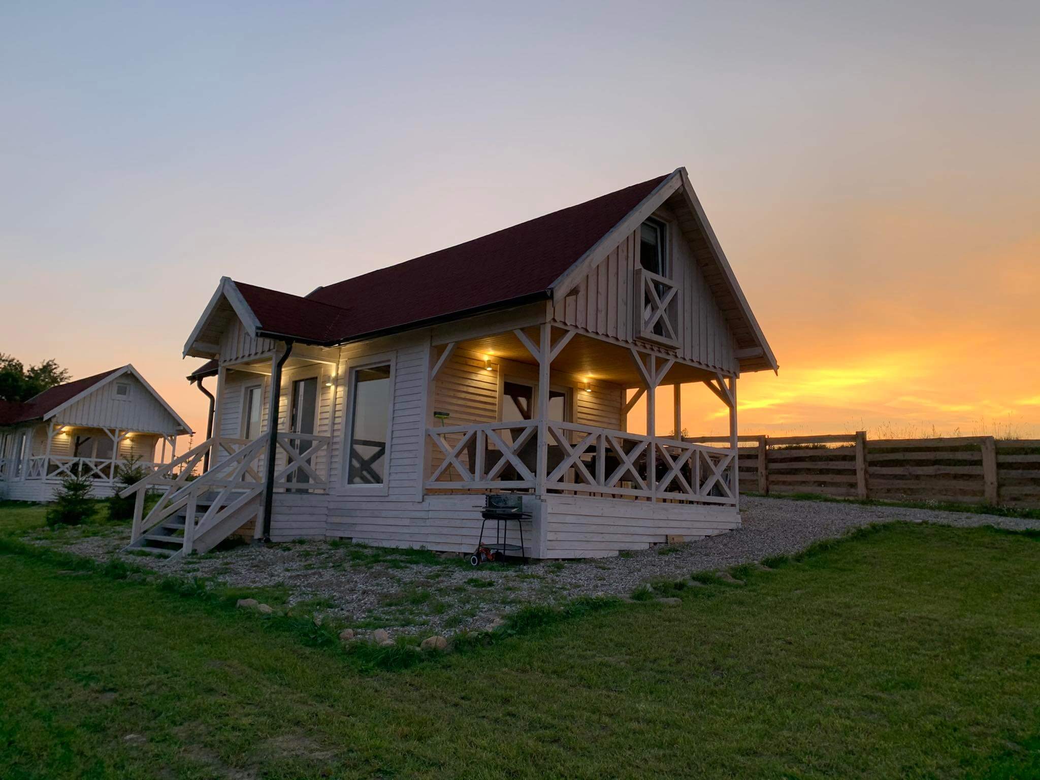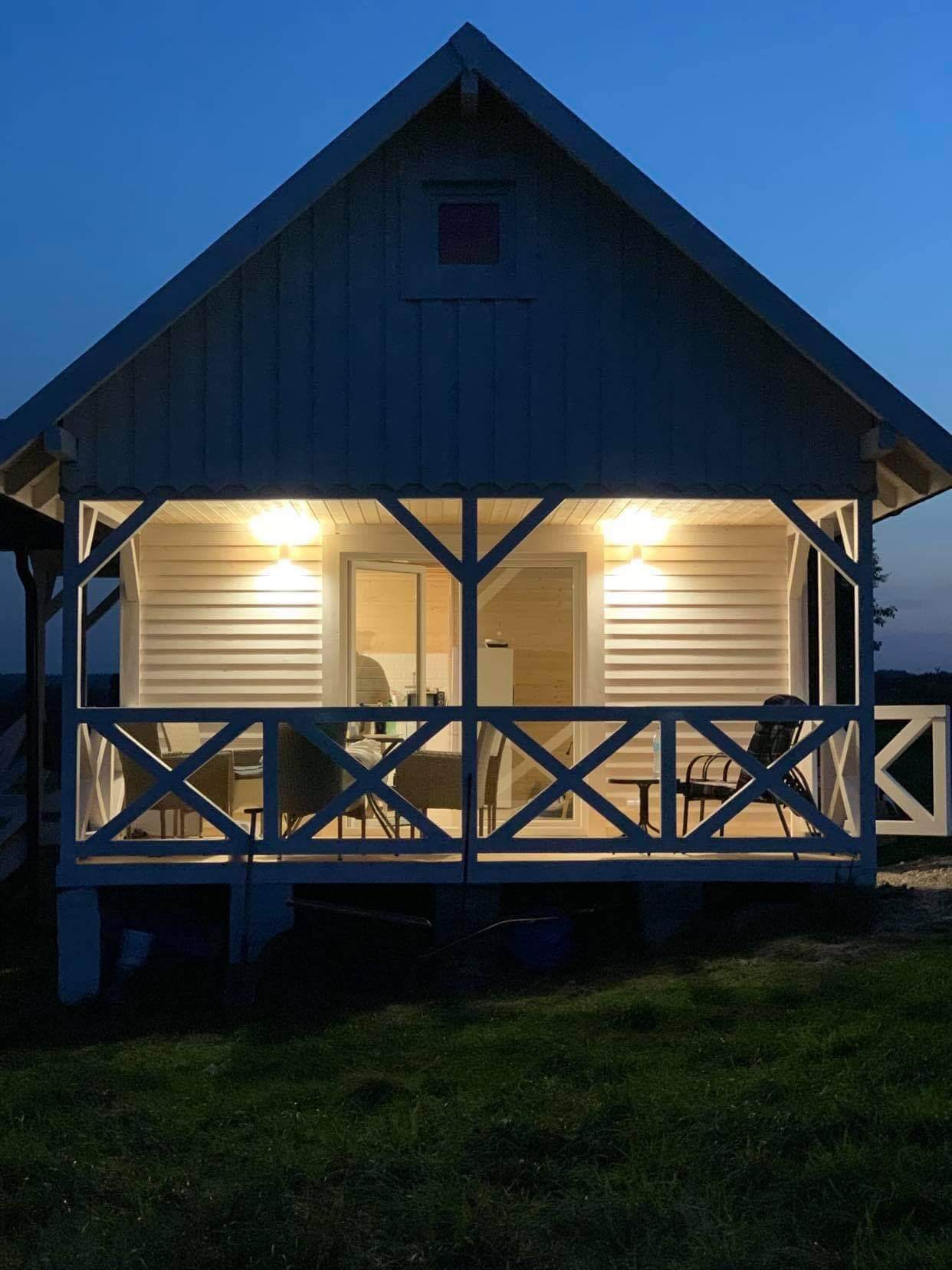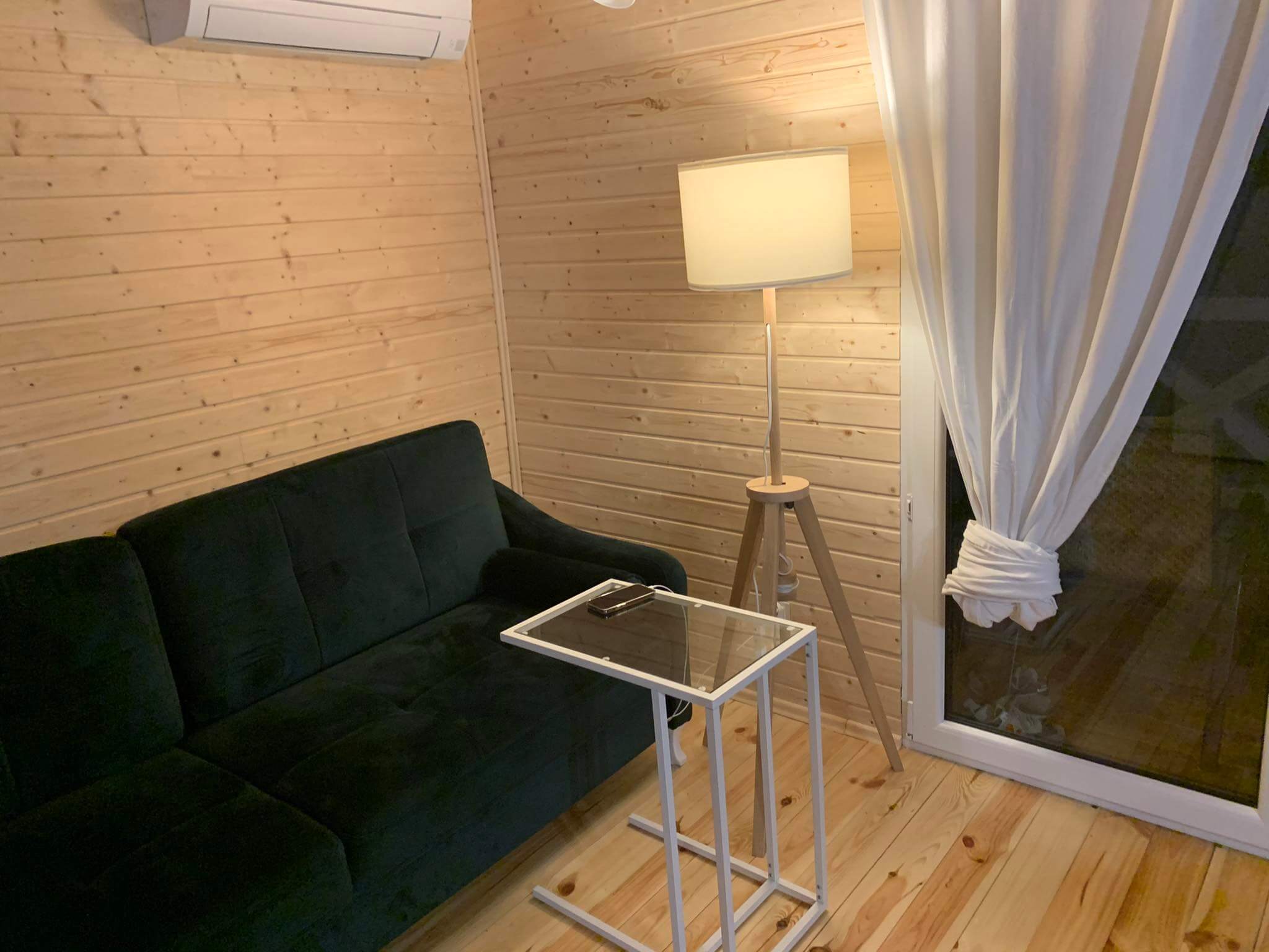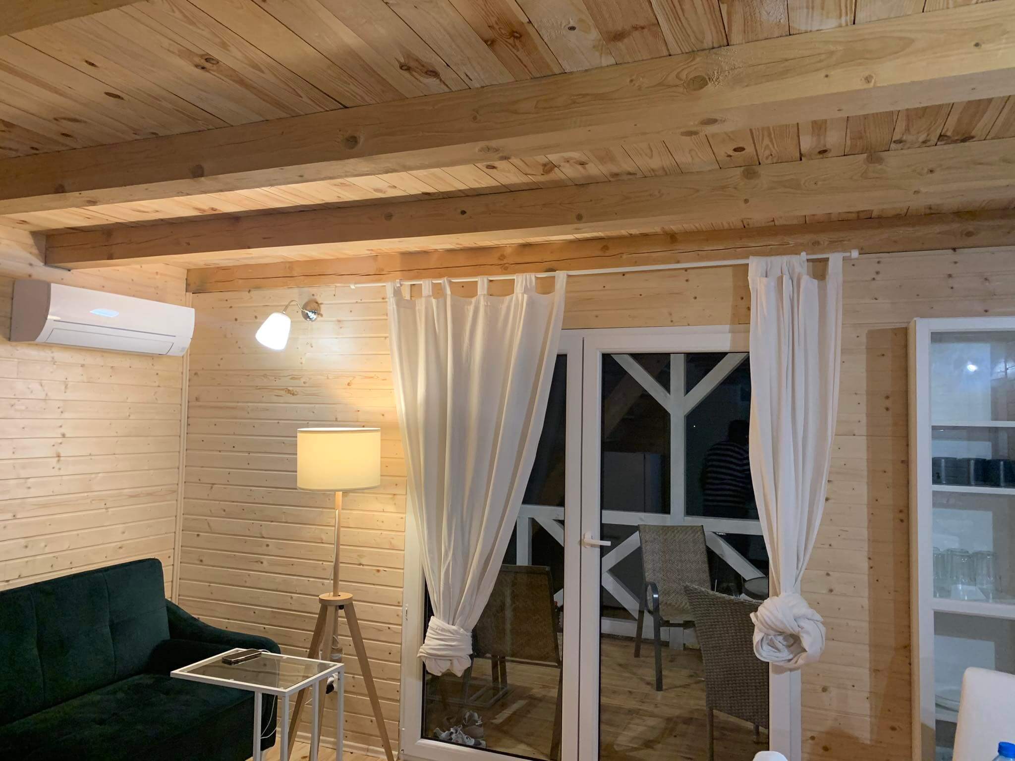 Drewniane domki letniskowe, 1-6 osobowe, pow 70m2. Do dyspozycji gości parter: salon z rozkładaną sofą, stół z krzesłami, aneks kuchenny wyposażony w lodówkę, zmywarkę, czajnik, kuchenkę gazową, naczynia. Oddzielny taras z meblami ogrodowymi. Piętro: 2 sypialnie dwuosobowe.